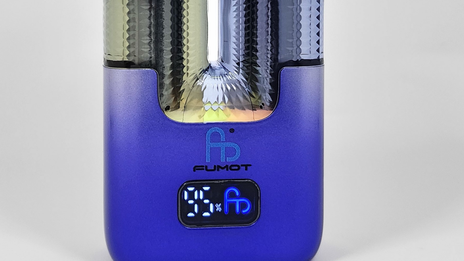 It has a small LED screen on the front of the device that shows a small Fumot logo and a percentage indicating the remaining battery charge.