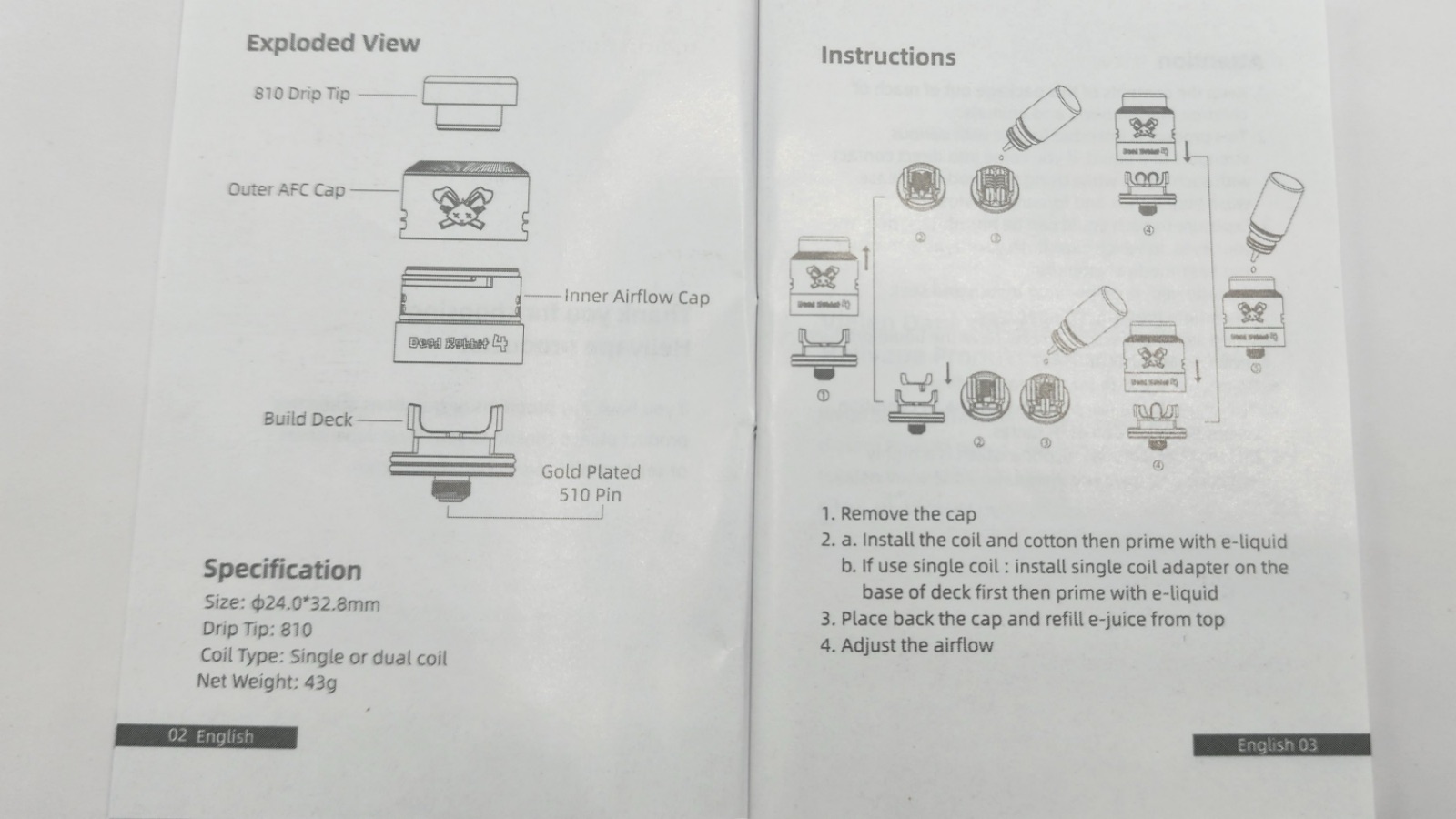 The Dead Rabbit 4 comes with two 810 drip tips. I personally like the default metal black tip, but that could also be because I got the black variant of the RDA. But the resin-styled tip also looks awesome. It’s really cool that they included two options to pick from.