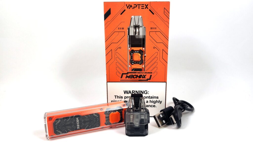 The Vaptex Mechax is a pod device with a 400mAh internal battery, a 2mL e-juice capacity, and a design that is intended for MTL (mouth-to-lung) vaping (learn more about it here). It also has a unique see-through mechanical design, which is where it gets its name from.