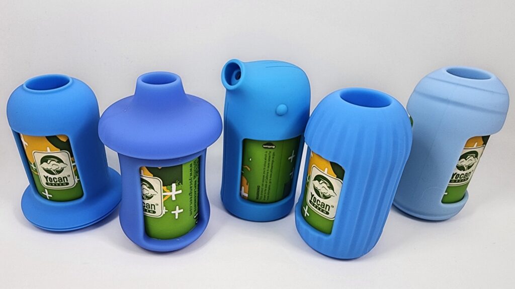 The mushroom sleeve comes in pink, blue, yellow, and black. This is a lot like the flying saucer model as far as size goes. It’s a lot less portable than the penguin, pinecone, and whale, but it’s not enormous, and it’s fun. The mushroom model also has a unique extended mouthpiece like the penguin does, so some people might like this one more for that reason.