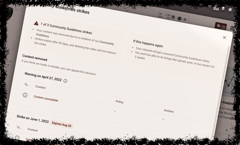 I’ve even received several warnings and a strike for mentioning the site that sent me a product for review. It starts with a warning (sometimes, if you’re lucky), but the second infraction becomes a strike. And if you get three strikes, the channel is shut down permanently.